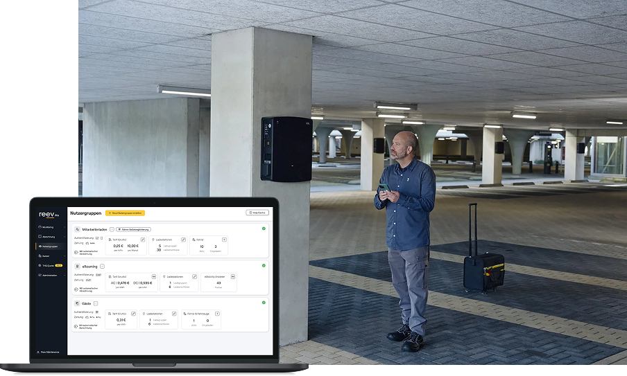Diese Lösung vereint die vorkonfigurierte eM4 Ladestation mit intelligenter Software zu einer schlüsselfertigen Einheit. Über das reev Dashboard lassen sich Ladestationen, Ladevorgänge und Nutzerdaten zentral sowie intuitiv steuern – für ein effizientes Management der gesamten Infrastruktur.