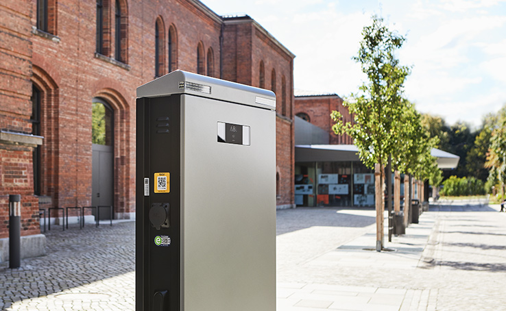 Die Ladesäulen eMC2 und eMC3 fügen sich durch das pulverbeschichtete Metallgehäuse in jede Umgebung ein.